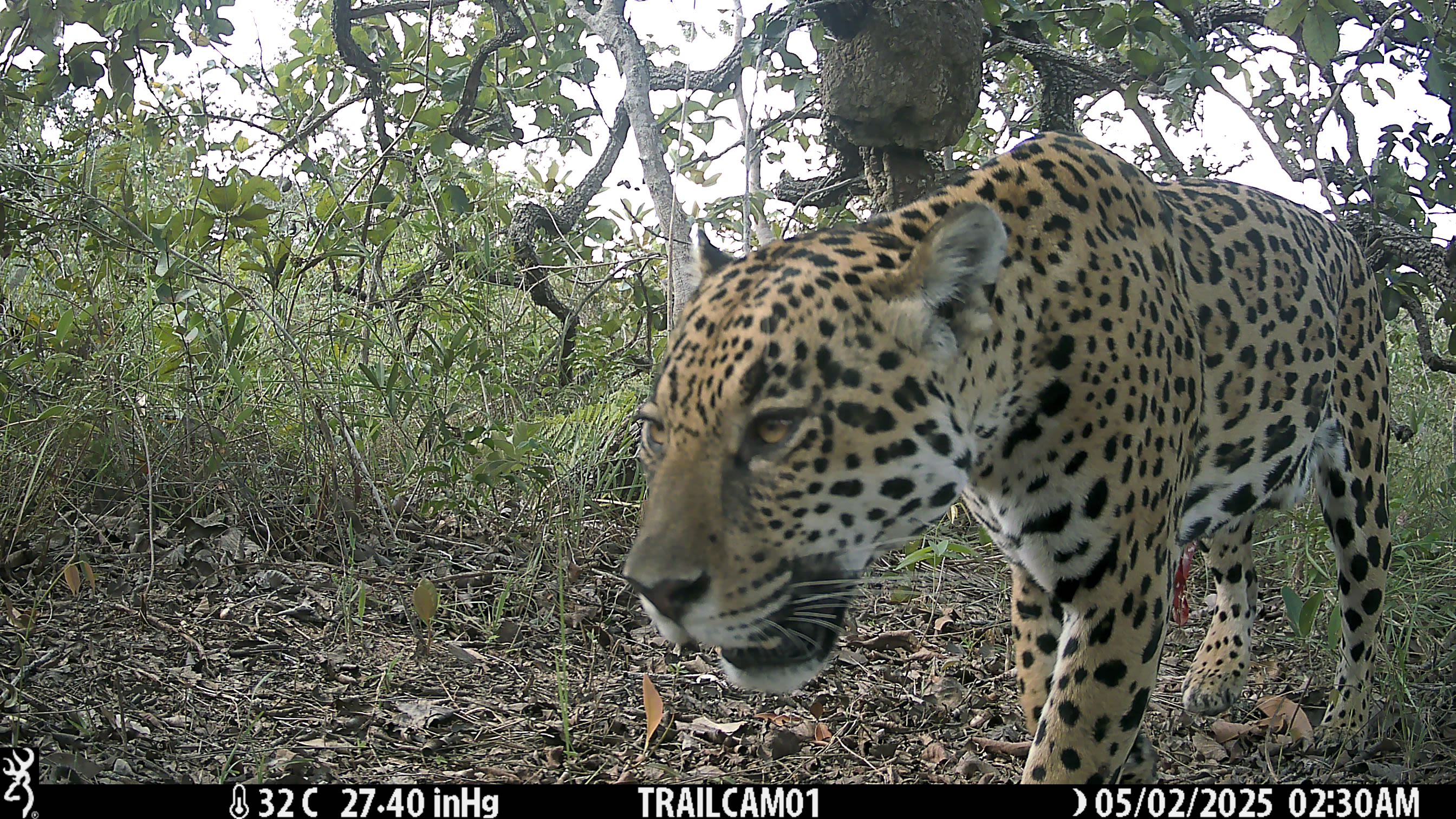 September 2025 A jaguar (panthera onca) has been spotted by a camera trap set up in the Peruacu mosaic. The biggest cat species in the Americas, jaguars have a unique coat of pale-yellow fur covered by dark spots and rosettes to help them blend into the forest environment. Sadly, the species is threatened by habitat loss. Reforestation projects like Rewild Carbon are vital for the future survival of this beautiful big cat.
