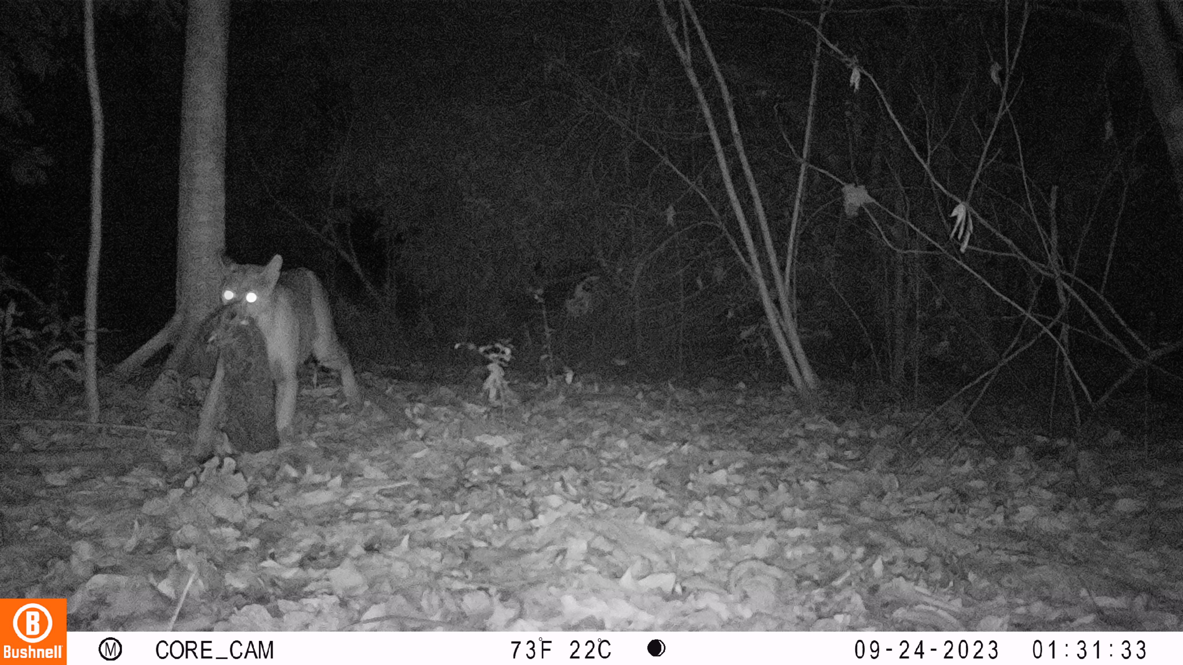 June 2024 Cameras placed in Polygon 4 just a few months after planting recorded this puma carrying prey through the young trees. Pumas are solitary cats, most active at dawn and dusk, and they feed on a wide variety of prey. Their numbers are declining due to loss of habitat. Reforestation projects like Rewild Carbon are essential for the long-term survival of the species.